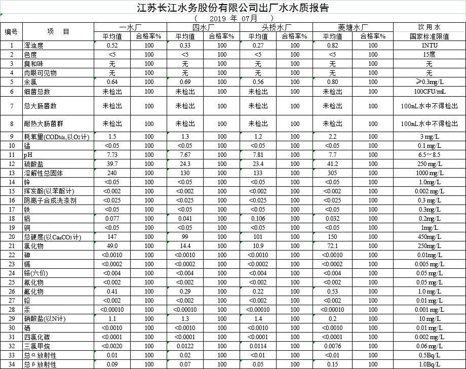 自來(lái)水水質(zhì)報(bào)告(2019年7月份)