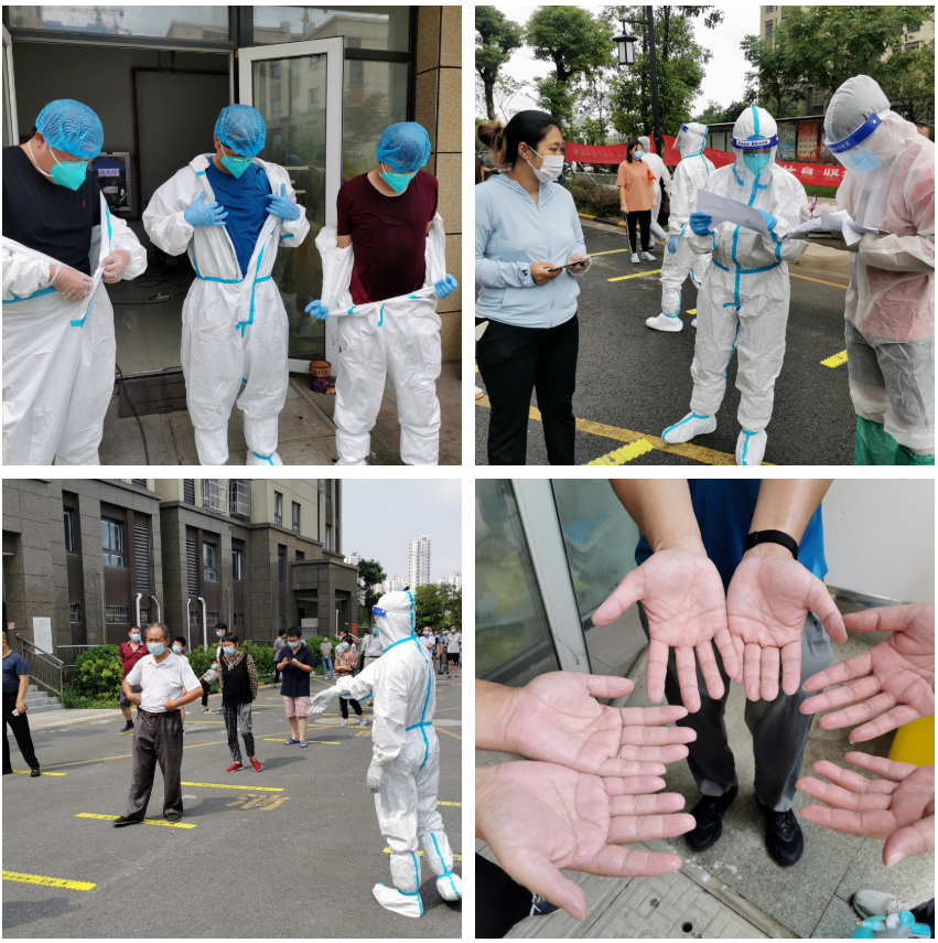 “幫我對(duì)照下防護(hù)服穿戴教學(xué)視頻,順序?qū)Σ粚?duì)?全部保護(hù)了沒(méi)有?”這是志愿者首次穿戴全套防護(hù)用具時(shí)忐忑的話語(yǔ)。初次接觸防護(hù)服,雖然前期教學(xué)培訓(xùn)過(guò),但內(nèi)心期待中還有些許緊張,動(dòng)作生疏卻很仔細(xì),大家相互幫忙、相互學(xué)習(xí)、相互監(jiān)督,確保不留任何漏洞,檢測(cè)過(guò)程中,大家要做好測(cè)量體溫、核對(duì)人員信息、核查健康碼、提醒保持安全距離、幫助老弱病殘及特殊人群等工作,有時(shí)還要應(yīng)對(duì)暈厥的居民、易怒的群眾情緒以及少部分特殊群體的交流障礙,一次核酸檢測(cè)的時(shí)間大概在3小時(shí)左右,這樣高強(qiáng)度的工作環(huán)境,大家沒(méi)有任何怨言,除去防護(hù)服的那一刻,看著臉上深深的勒痕、滴水的上衣和發(fā)白的雙手,有的只是相視一笑,再次投身到小區(qū)封控管理工作中去。