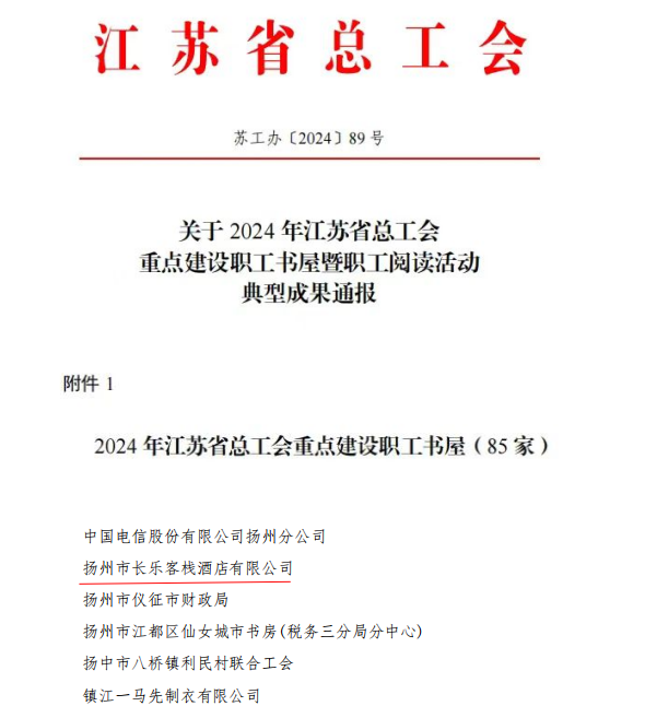 近日,江蘇省總工會發(fā)布重點建設(shè)職工書屋暨職工閱讀活動典型成果通報,揚州市長樂客棧酒店榮獲“2024年江蘇省總工會重點建設(shè)職工書屋”稱號。