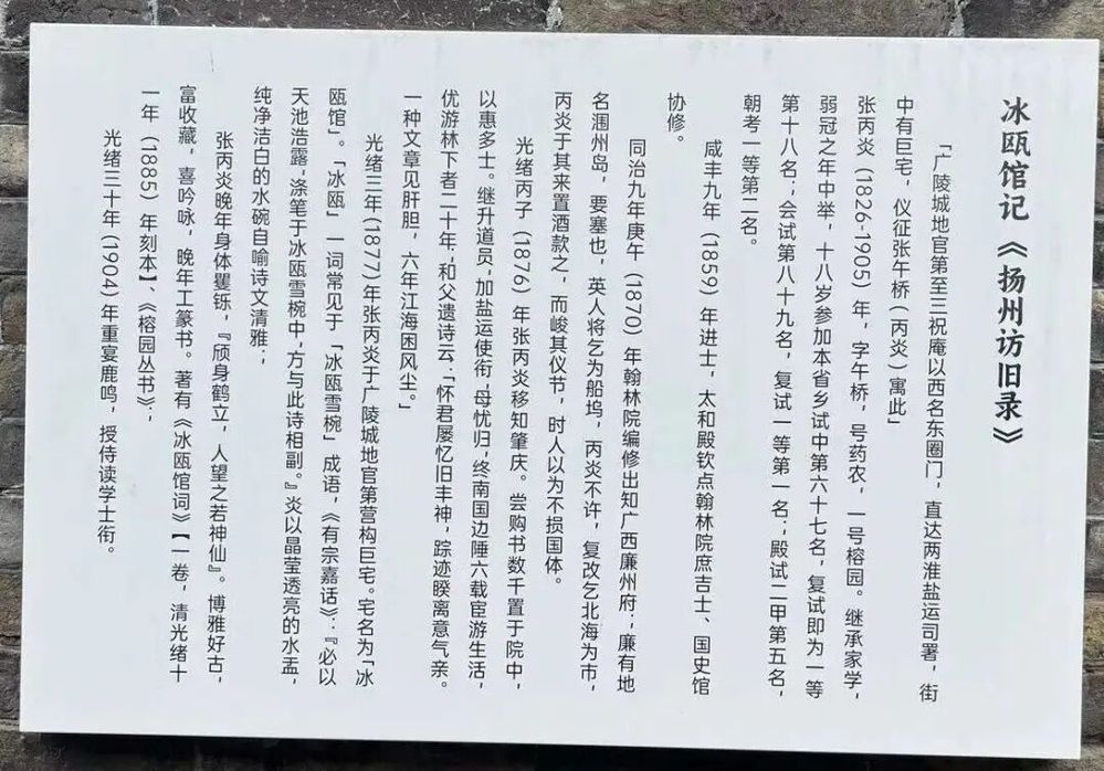 在揚(yáng)州東圈門地官第12號,一座七進(jìn)七出的徽派建筑群靜靜矗立。這座名為“冰甌館”的宅邸,由清代進(jìn)士張丙炎于光緒三年(1877年)營建,其名取自“冰甌雪椀”的典故,既喻詩文清雅,亦暗含士人精神之純凈。作為晚清揚(yáng)州文化史的重要地標(biāo),冰甌館不僅承載著張丙炎的生平軌跡與學(xué)術(shù)成就,更成為透視清代士大夫文化傳承與轉(zhuǎn)型的微觀樣本。