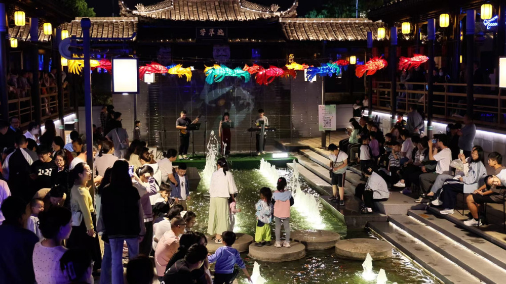 市集之上,音樂聲與歡笑聲交織回蕩。樂隊的精彩演繹中,動感旋律瞬間點燃觀眾熱情,不少市民、游客主動登臺獻唱,沉浸式享受熱鬧氛圍;古運河邊軒窗輕啟,舞者于窗前水袖翻飛,不時與河邊游客互動,為喧鬧市集注入了鮮活靈動的氣息。