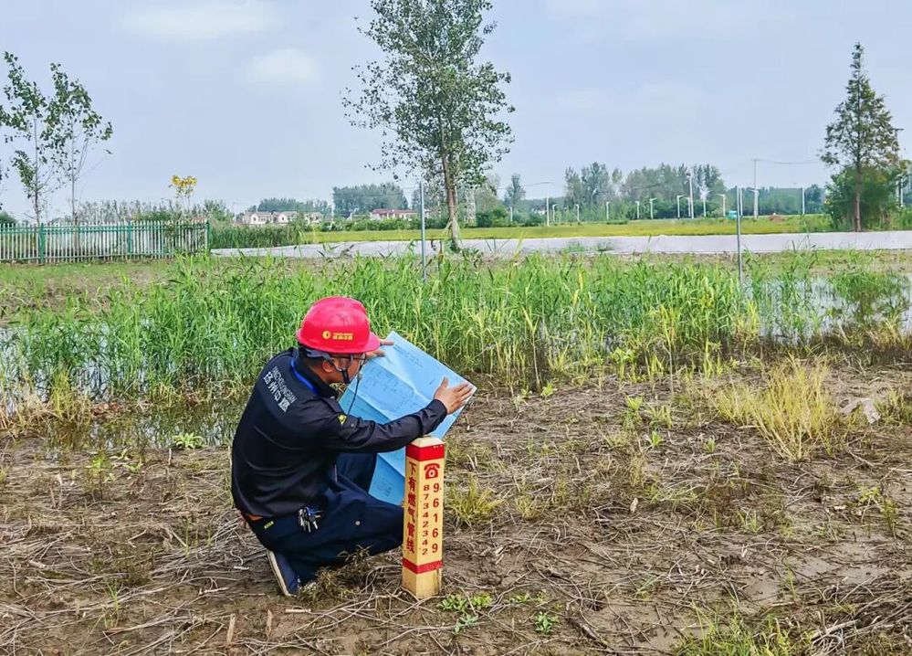 今年7月盛夏,韋煒一如既往例行巡線,途中行至沙頭門站,發(fā)現(xiàn)向東約50米處一小河塘正施工開挖擴建。他立即想起原較淺小河塘下面有一根中壓PE315運行燃氣管道,控制著李典鎮(zhèn)、頭橋鎮(zhèn)氣源,且河塘兩側(cè)均有燃氣管線標(biāo)識樁,河塘施工前并未收到管線對接通知。韋煒第一時間向部門領(lǐng)導(dǎo)匯報現(xiàn)場情況,隨后走訪群眾尋找到河塘主人和所屬村村委會進行交涉。